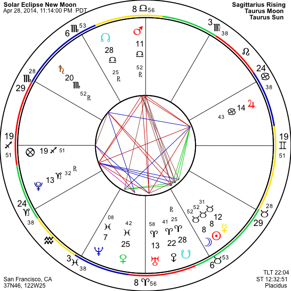 The Solar Eclipse and New Moon of late Monday evening, early Tuesday morning, in Taurus, completes the duo of April eclipses. Following the exact alignment of the mid-April cardinal grand cross that featured Uranus and Pluto, this lunation still partakes of the Uranus-Pluto square and has the feel of an extra-powerful New Moon. The Sun and Moon in conjunction are found across the Zodiac from the stodgy and limiting energy of Saturn and in forming inconjunct with a self-reflective Mars in retrograde. We are launching ourselves out into new activity, in very practical terms, and the question becomes, activity to what purpose? It is a truism that these difficult times have left us wondering where to turn, and Uranus in square with Pluto speaks to exactly this issue. We must finally come down to an amalgam of practical necessity combined with inner knowing, addressing that place in the social setting where we feel within ourselves the ability to plug in, in a meaningful way, and also where we feel the call to make that contribution that is uniquely ours to give.