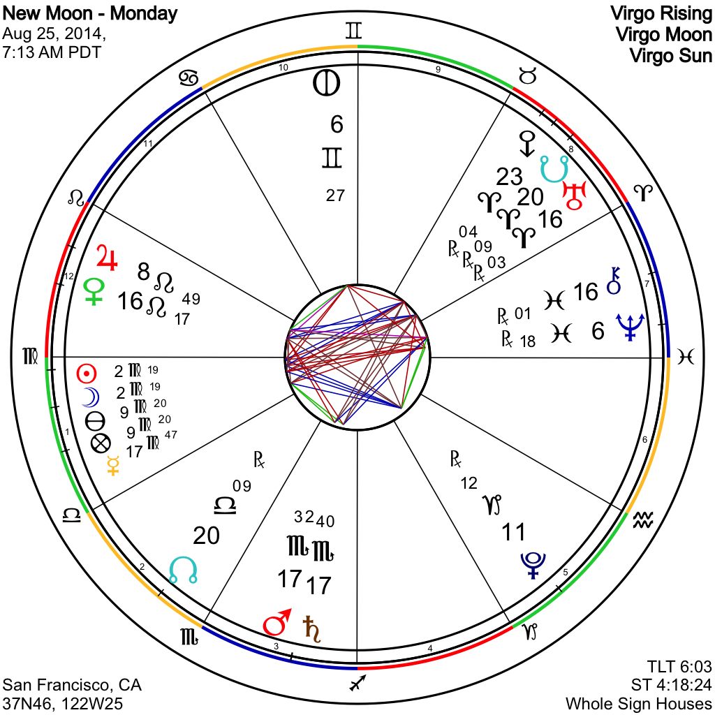 The Virgo New Moon, taking place early on Monday morning, is a powerful one, bringing an essentially spiritual quest into up close and personal connection with our more ordinary material pursuits, and providing moments of startling clarity. This is because, as the energy peaks in the first few degrees of this mutable Earth sign, implying new beginnings of a grounded and practical kind, there are also many outer planet connections made to personal planets. The New Moon is opposite to Neptune, while Venus in mid-Leo trines Uranus and squares Saturn and Mars. Meanwhile, Mercury at 17+ degrees of Virgo, near the Sun and Moon, is sextile to Saturn and Mars and opposes Chiron. Mars makes an extremely close conjunction with Saturn, within a sixth of a degree, just at the timing of this New Moon.