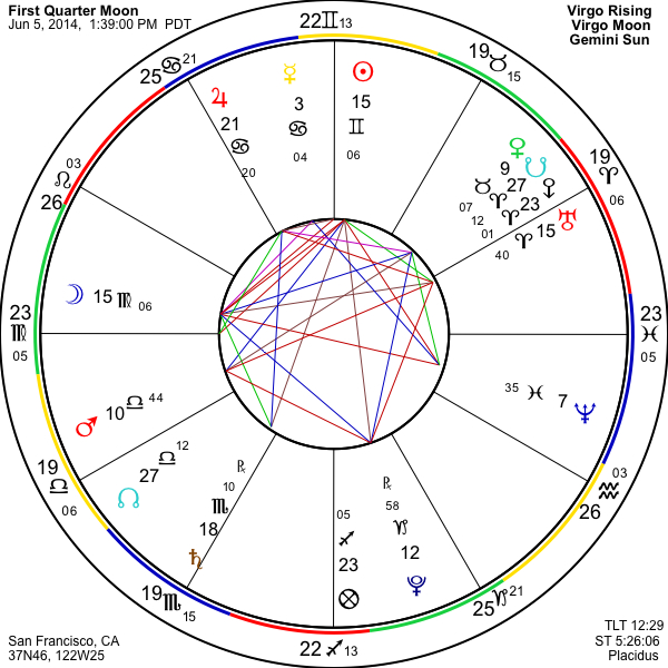 The Sabian Symbols for this First Quarter Moon are, as almost always, illuminating. For the Sun, in the sixteenth degree of Gemini: "A woman suffragette, advocating her cause," for which Marc Edmund Jones adds "unswerving determination to expand every potential of being." For the Moon in the same degree of Virgo: "An orangutan." For this image of primitive human-like functionality Jones adds that the symbol represents "[one's] ability to strip himself [or herself] to fundamentals, and there stand proudly, on [one's] own." We can indeed take courage from these symbols, that as much as we might be up against the wall, as long as we can look deeply within ourselves, and decide that our cause is just, thereby resting assured that we are in our essential hearts correct, why then, we can just go ahead.