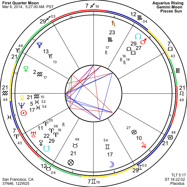 Saturday's First Quarter Moon in Gemini is interesting for several reasons. One is that the Moon, in Mercury's sign of Gemini, makes an aspect to Mercury, which, still relatively introspective and recovering from the recent retrograde, is also almost exactly square to Saturn. We have therefore a curious and a thoughtful time of it right now, as we struggle to understand our own psyches, and our place in a rapidly changing universe, transforming along the lines of both inner and outer dimensions. Another powerful factor in this Quarter Moon timing is the close aspect made by the Sun to Chiron, the Wounded Healer, which was exact a few days prior. Thus, as we look inside, we might find evidence of dysfunctional patternings, the residue of ancient trauma, dark areas of the psyche that are symbolized by this recently discovered planetoid.