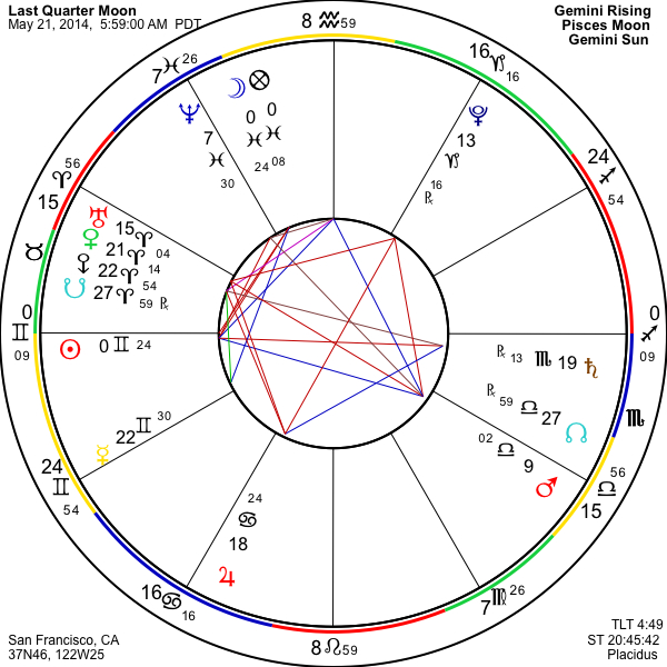 Since Venus is prominent in the chart of this Last Quarter Moon, along with Mars, and because this lunar phase is philosophical in nature, all about reassessing where we have been, as well as where we are going, and why, the time period of the next seven days leading up to the Gemini New Moon involves meditating on the concept of relationship motivation with significant others in our lives versus independent action. With Neptune so involved we are also being asked to plumb the very depths of ourselves in order to better define the question and to seek out the glimmer of an answer. We all need each other, in both obvious and subtle ways, and yet we need autonomy as well. Too much of either and we lose something precious in the process. It is, in general, a delicate balance that you may need to strike, as you consider what relationship in your life means to you, and how to make it work, and as you strive for the highest and most complete understanding of yourself, at all levels.