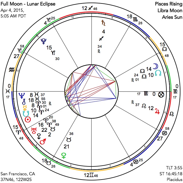 The Sabian Symbols for this powerful Full Moon eclipse have something to offer us as well. They are, for the Sun, in the fifteenth degree of Aries: "An Indian weaving a blanket." We might take this for the blanket of life, symbolic of a return to natural values, and for the realization that all men and women, no matter their racial origin, are ultimately of one tribe. Marc Edmund Jones relates this to "personal fulfillment through simple elegance of self-expression ... the quiet persistence of each proper act of self." For the Moon, in the same degree of Libra, we find: "Circular paths," for which Jones has "subjective fulfillment by a thoroughness of participation in experience... — every individual's gift for remaining true to himself [or herself] at center." Indeed we must remember to be ourselves at all costs and in spite of whatever the world can manage to throw at us, to partake always of that which we know we are, and to do that which we know we can do, in the nature of helping to advance our struggling civilization beyond its current darkness into the light of higher knowledge.