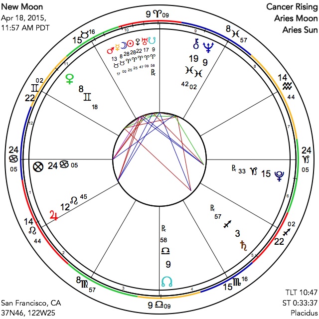 The New Moon taking place on the late morning, afternoon or evening of April 18th, depending on location, is an active one, with plenty of outer planet emphasis, particularly the mystical presence of Neptune. The Sun and Moon, conjoined in late Aries, are in wide aspect to Neptune while Saturn remains in square. Mercury, located in the following sign of Taurus, is in close sextile with Neptune. Venus in Gemini adds to this emphasis, being in close square with Neptune and in mutual reception and semi-sextile with Mercury. This combination implies that at this important juncture that begins the next lunation cycle, the strictly logical process of cause-and-effect thinking that forms the greatest part of our awareness will be only one part of the story; unconscious process is being brought forward to an unusual degree of prominence as we contemplate life and love.