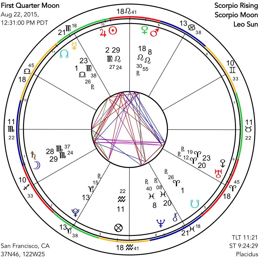 Saturday's First Quarter Moon in the last degree of Scorpio, conjunct Saturn just one degree away, takes place just as the Sun is getting ready to enter the sign of Virgo, on Sunday, and also coincides with an important stage in the Sun-Venus cycle. Like the Moon, Venus goes through her cycle with the Sun, only instead of the thirty-day synodic cycle of Sun and Moon, we have a far more complex 584-day cycle that results in a new sign for each new beginning point, considered to be her first rise as the Morning Star. This moment of the Heliacal Rise of Venus has just arrived, on August 21st, and we have a brand-new cycle of Venus now coming into the picture. This is very much in line with the current Venus Retrograde period, due to end with Venus' station to direct motion coming up in two more weeks, on September 6th. During this 40-day period, thus extending from late July through the current month of August and into the first weekend of September, Labor Day weekend in the United States, we are involved at the deeper layers of our psyches with the planet of relationship, commerce, and beauty. Because delving into our own unconscious depths, as indicted by the current astrological symbolism, we are looking far more closely into our finances and our aesthetics, as well as our partnering motivation and patterning.