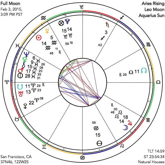The Sabian Symbols for this Full Moon are once again instructive. They are, for the Moon, in the fifteenth degree of Leo, "A street pageant with spectacular floats," which can refer to the glorification of self-expression in support of a cultural imperative. Marc Edmund Jones relates this to "a very human pride in common works and cooperative accomplishment... an irresistible heightening of self-significance." This symbol is thus in close alignment with a greatly highlighted presence of Jupiter in Leo, in the context of the strong Aquarius theme. For the Sun, in the same degree of Aquarius, we have: "Two lovebirds sitting on a fence," which connotes the happiness that is possible when humans come together in love, and also perhaps hints of a shadow in the complacency involved in seeing the world in purely blissful terms. Jones relates this symbol to self-affirmation, and states: "There is high magic in any inner psychological completeness, so that in consequence the whole world loves a lover... [a human] achieves his true destiny as he embraces his [or her] fellows in a reality he has made his own." Together, these symbols speak to the twin goals of self-fulfillment without self-aggrandizement, and the imperative of individual action to foster a healthy society that can take us forward into succeeding decades.