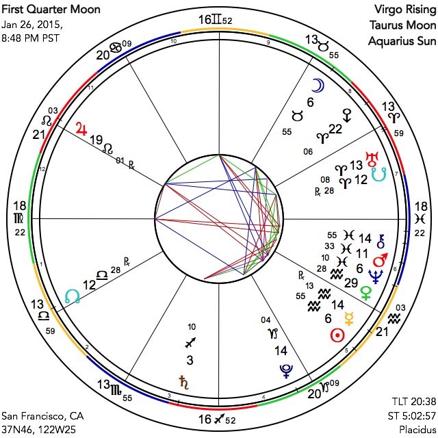 We are indeed in this climactic new year of 2015 faced with quite a bundle of unresolved promise for radical change, that which we know that we need to do for the sake of our continued growth as human beings, and still have yet to find the courage to totally act on. Does it actually help to be taking this situation, an ultimately practical one, out to the higher-level perspective that Neptune provides? I suppose that you could make an argument either way. What we need now is clarity of purpose, and Neptune is all about cloudy imprecision and vague fantasy, either rosy or else more dire than is even warranted. And yet, with both Jupiter and Neptune emphasized, we do have a spiritual foundation available to us that can actually aid us in finding our way forward in spite of anything. Either way we have come to a crux of activity, one keyword for this lunar phase that Dane Rudhyar called a 'crisis of action.' It might be beneficial to recall the advice of the television hero of the 1950s, based on the character of pioneer Davy Crockett, who said "Be sure you're right, then go ahead."