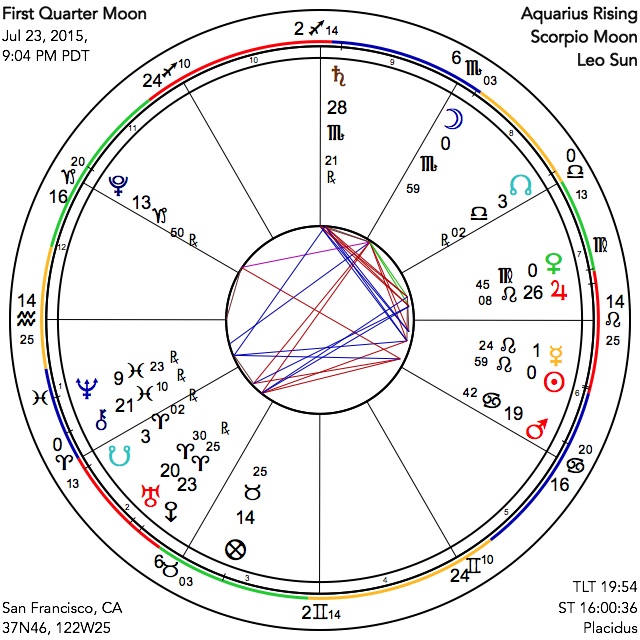The First Quarter Moon is the lunar phase when the rubber meets the road, regarding the impulse from the New Moon that is currently working itself out in your life. This is the time when you encounter the difficulties, or the drawbacks, and are tested to find the courage of your convictions. Also, in this quarter moon configuration, Pluto is once again emphasized, being contra-parallel both the Sun and Mercury, in their close conjunction in the first two degrees of Leo. This aspect pattern implies that logical thinking is an important component of our current arc of evolutionary development; we have a lot to deal with and we must apply our mental resources to the hilt in trying to sort out what we are truly up to, and where we must rise to the occasion in order to commit to what is necessary for our continued well being.
