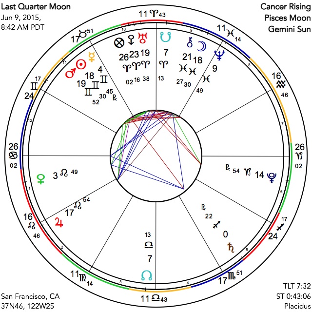 Tuesday morning's Last Quarter Moon comes along at a very interesting time. We are at a key moment in the very thoughtful Mercury Retrograde period that has been eye-opening, perhaps more so for those who like to look within themselves, and we are also settling into the aftermath of the famous Uranus-Pluto series of exact square formations that finalized last mid-March. At that time, Pluto was at the 15-degree mark of Capricorn, or the 16th degree as I like to call them, in line with the way that these individual degrees of the Zodiac are referenced in the Sabian Symbols oracle. In thinking of the ongoing metamorphosis that we are in the midst of, we might note that Pluto was closely aspected by Jupiter at the timing of the mid-May New Moon that began the current cycle, remaining at the 15-degree mark of Capricorn, and now retrograde, while in this final quarter moon configuration, the Moon and Pluto form a yod to Jupiter. The Moon also conjuncts Chiron, provided further food for meditation on the subject of inner wounding, as well as the impulse for healing. We are thus in a heightened time of deep reflection that is signaled as well by the culmination of the Mercury Retrograde period, with Mercury standing almost dead-still in the sky, stationing in two days' time, and opposed to Saturn, equally lending extreme focus. We indeed have quite a lot on our minds, not least the cultural transformation that we are still in the midst of recognizing.