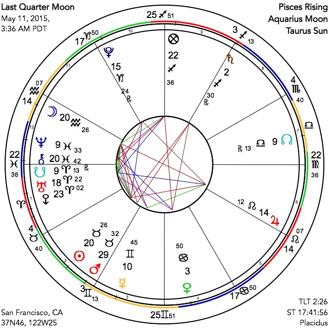 The Sabian Symbols for this Last Quarter Moon as usual have something to contribute. They are, for the Sun, in the 21st degree of Taurus (or 21 plus): "A finger pointing in an open book," which reminds us that the higher meaning of what we are about is right there in front of us, once we have the courage to look inside. Marc Edmund Jones comments on "a sensitiveness to the enduring significance of each special complex in human affairs," and on the "fine discrimination" in achieving this insight. For the Moon, in the same degree of Aquarius, we find a different side of this same idea: "A woman disappointed and disillusioned." For this Jones reflects on "the self's inherent gift for pressing on, with every setback," and as well "the inevitable distress of the human soul whenever it seeks enduring sustainment ... without anchorage in its own nature." This is indeed the trap of Saturn, and of disappointing circumstance, whenever you allow yourself to be blocked from your own higher purpose. We bounce back from disappointment by having the faith to go to inner strength and to keep our eye on the real prize, for then nothing can stop us.