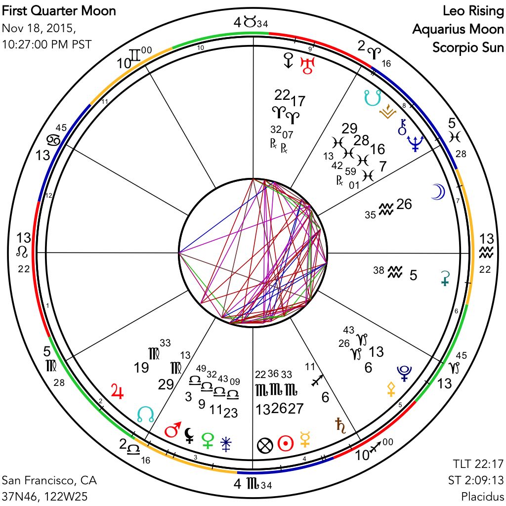 The First Quarter Moon of Wednesday late evening, by West Coast time, will take place in the early hours of Thursday morning for the East Coast — and of course even later for further east. This will be an interesting lunation, primarily for the connections made between the inner and the outer planets. Mercury is conjunct the Sun, just escaping by one degree his tightest embrace, creating a thoughtful ambiance, while Venus in exact minor aspect with the Sun and Moon, is also in forming square to Pluto, thus providing a sense of our ongoing transformational process. The Sun is parallel to difficult Saturn, while the Moon closely parallels mystical Neptune. Saturn slows us down, and Neptune relates to inner values and also to escapist tendencies. Mars in the early degrees of Libra is in forming sextile with Saturn, thus indicating that while things will not go entirely smoothly over this somewhat difficult quarter Moon timing, they might eventually be able to resolve themselves.