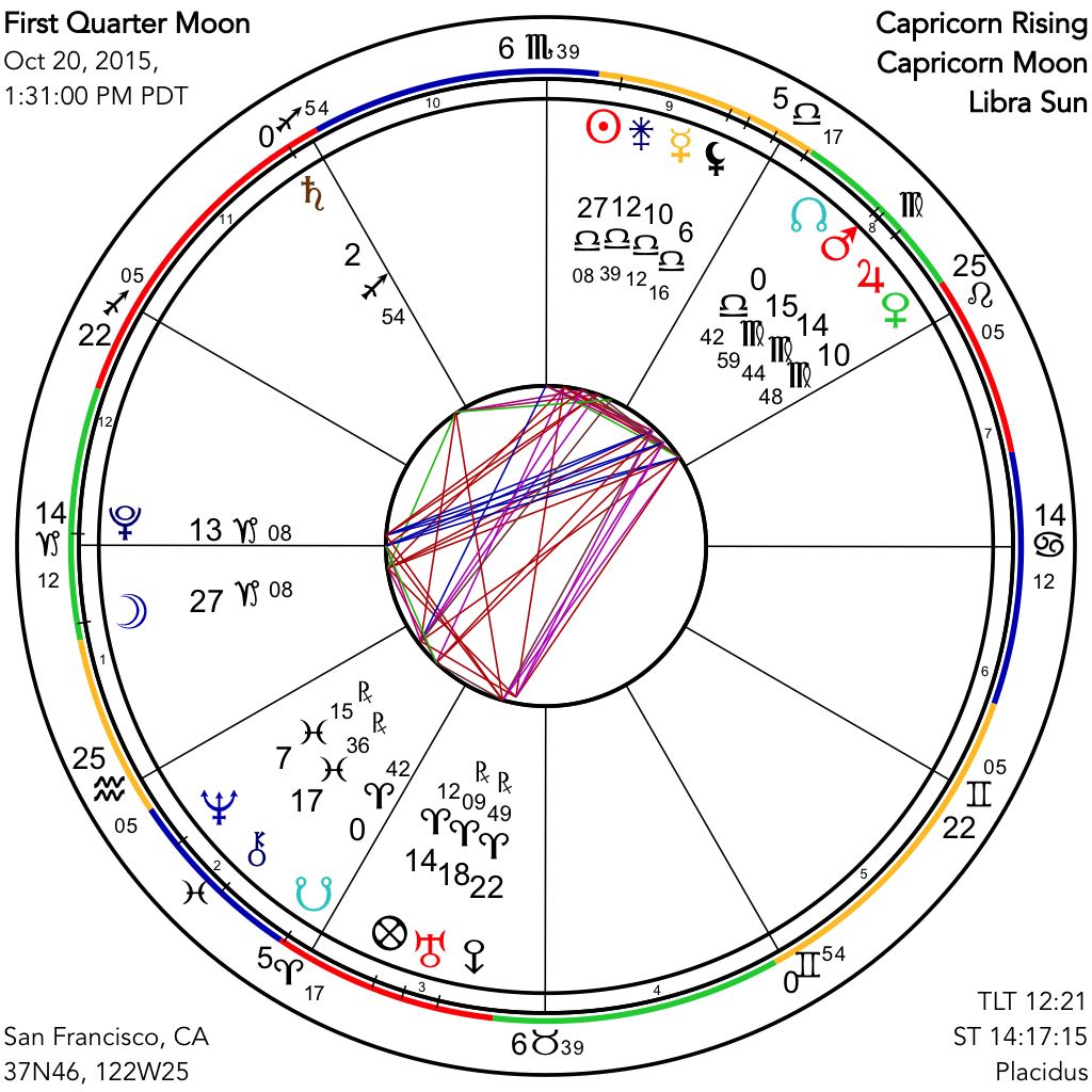 The Sabian Symbols for this First Quarter Moon are, as usual, quite instructive. They are, for the Sun in the 28th degree of Libra, "A man in the midst of brightening influences," which perfectly describes the strong Jupiter-Uranus parallel of this quarter moon configuration, converging with Sun, Moon, Venus, Mars and Eris. Marc Edmund Jones refers to "a complete spiritual fellowship with humankind," and goes on to state, "implicit in the intangible symbolization is an encouragement on which any individual may count, knowing that his or her unflagging courage in pressing forward, on [the] pilgrimage from darkness to light, is the best of all possible guarantees of achievement." For the Moon, in the same degree of Capricorn, we find, "A large aviary," and this Jones relates to the unending variety of life, another Uranian theme. He goes on to reference the "common welfare," and the "wide spread of aspiration [that] is encompassed in the over-all realization by which [mankind] is organized... everyday problems have their solution in this breadth of resources." Indeed we are all unique individuals, with vastly different beliefs and goals, and yet we must somehow be able to find a way to come together in commonality of philosophical purpose for participation in the important project of saving our civilization. The need as great; and, as well, the time is short to be taking well-considered action, thus fostering the spiritual growth implicit in our own development, and in that of our earthly environment that surrounds us and sustains us.