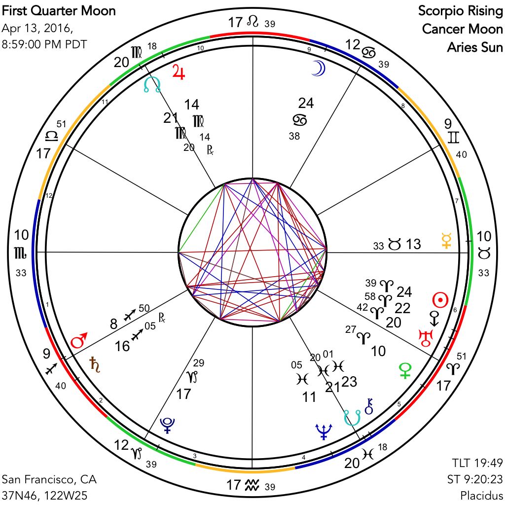 The Sabian Symbols for this First Quarter Moon have, as usual, something important to contribute. They are, for the Sun, in the 25th degree of Aries, "A double promise," which reminds us of the dual nature of mankind, as Devil and Angel, scheming animal brain and spiritual agent. Marc Edmund Jones remarks on this emblem that we must recognize the "unlimited capacity for seeing the world both inwardly and outwardly" referencing "the symbolical as well as the literal pertinence of everything that comes to [one's] attention." He goes on to state that there is in man "a facility of adjustment by which everything in a given situation may be brought to the fullest cooperation with everything else." And — we might add — given a meaning beyond the ordinary.