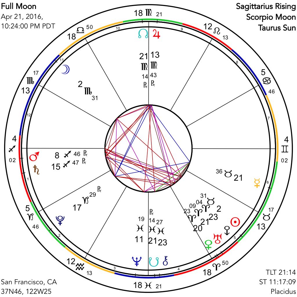 Thursday late evening's Scorpio Full Moon, coming along in the small hours of Friday morning for the East Coast and Europe, is another intense configuration. This is largely due once again to the powerful outer-planet presences that have been featured in almost every recent lunation. In particular, within a couple of degrees of 21-plus of their respective signs, we find Venus, Uranus, and Eris, in Aries, in close triple conjunction, a stationing Mercury in Taurus coming into extremely close parallel with Saturn and Pluto, and the Moon's nodal axis itself, at 21 degrees of Pisces and Virgo. These multiple connections between inner and outer planets bring up the latter's essentially transpersonal and transformative nature, where we are encouraged to see what lies deep within the unconscious portions of our psyches and to act on this numinous and other-dimensional understanding. Mars, newly retrograde, remains parallel to Saturn and Pluto as well, creating his own triumvirate of difficult and quite specifically internal energies. Casting our net wider, we find that Jupiter is square to Saturn, and in perfect parallel to Uranus, to the minute of a degree of declination. Jupiter is also trine Pluto and closely opposed, as well as contra-parallel, to Neptune. With Jupiter thus so strongly invoked, while remaining on the opposite side of the Zodiac from all these others, we have a surprising note of starry-eyed optimism that somehow enters into the picture of this dynamic and darkly resonant Full Moon, bringing in the lighter as well as the darker side of the human condition.