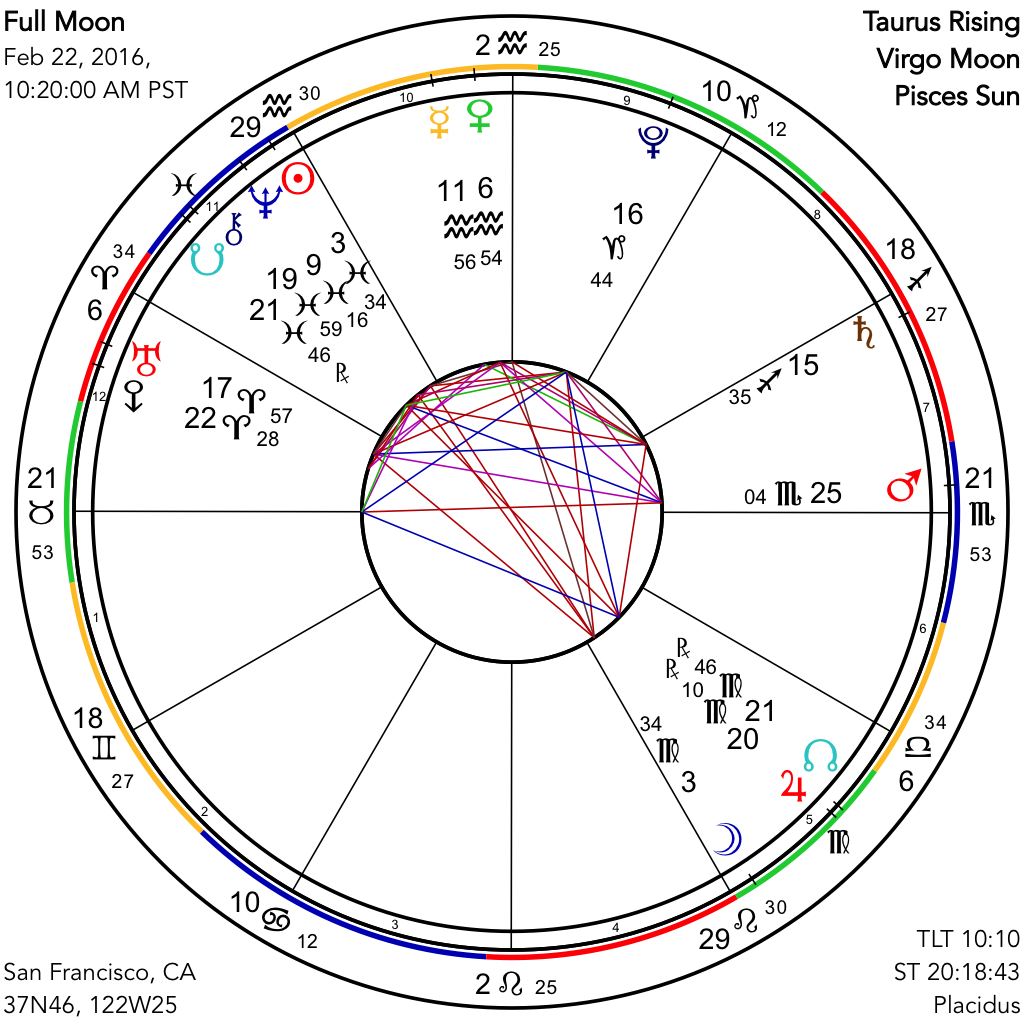 The Sun and Moon make minor aspects to Pluto, by sesquiquadrate and semi-square, so that Pluto is once again emphasized in this week's Full Moon configuration, as it was at the Aquarius New Moon that began the current cycle, and as it will be again in the timing of the Pisces Solar Eclipse and New Moon of March 8th. Positive and expansive Jupiter is also powerfully positioned now, in line with the lunar nodal axis, and in aspect to the new planet, Eris, which emphasizes whatever she touches in the sky, as revealed in birth chart analysis. Strong Jupiter brings a note of optimism into the picture, and a yen for a more peaceful and productive future.
