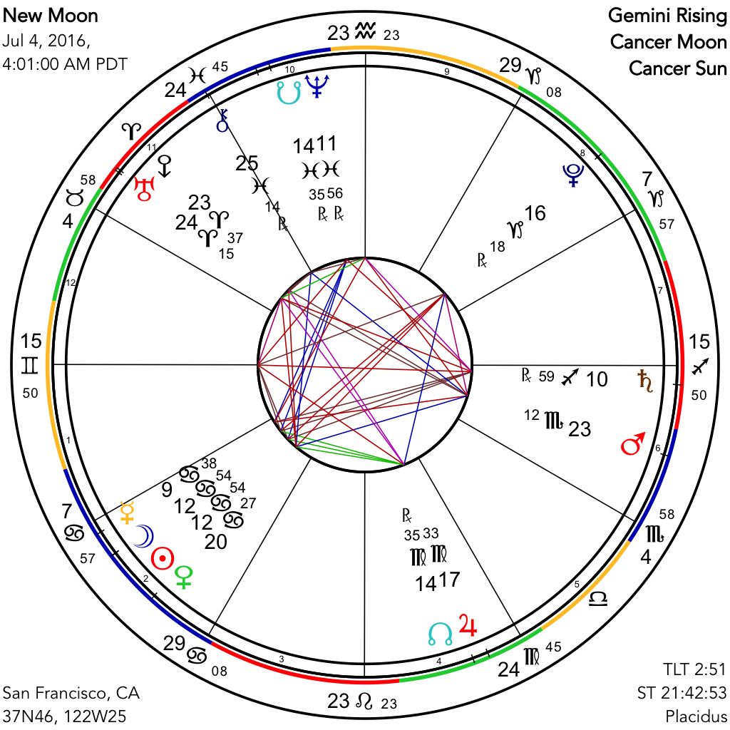 The Cancer New Moon of early Monday morning is another in the series of potent lunations that we have been seeing, in part due to the extreme contrast of Saturn-Neptune in square, and aspected by the Sun and Moon. Then, as well, both Uranus and Pluto are stimulated, implying that there is plenty of transformational pressure upon us as we head into what is sure to be an intense, divisive, and interesting summer period. With Sun, Moon, Mercury and Venus all in Cancer, this is a highly emotional time, now and setting the tone for the remainder of this thirty-day cycle, a period when everyone's feelings are right there, "on their sleeve," and in their facial expressions. Moreover, in this New Moon configuration a Grand Trine exists between Venus, Mars, and Chiron, the Wounded Healer, all in different Water signs, and this Grand Trine aspect pattern repeats throughout the month with slightly different players, most notably on Monday, July 11th and on Tuesday, July 19th with the Full Moon. With Chiron in this picture we might well find occasions when our inner wounding will arise in interpersonal contacts and hopefully be faced in a mature way; that is, with an understanding of its origin within oneself and with a powerful determination to become more comfortable and accepting of the walled-off parts of our own nature.