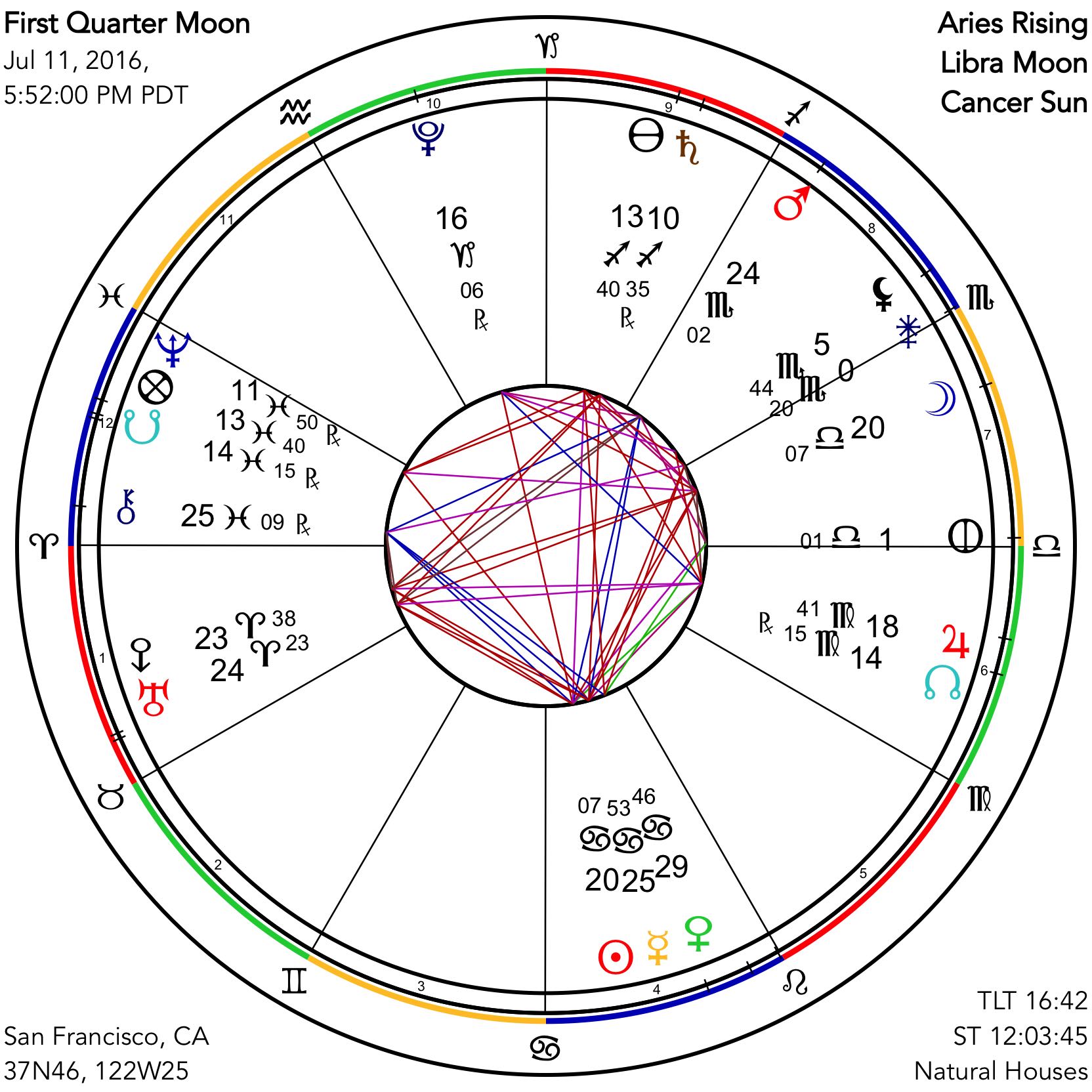 The First Quarter Moon in Libra, following the dynamic New Moon of July 4th, comes along in the late afternoon and evening of Monday, July 11th. The Moon is at 20 Libra, and the Sun at the 20-degree mark of Cancer, with Mercury and Venus nearby. This is the second lunation this month featuring a Grand Trine between personal planets together with Mars and Chiron, echoing the one featuring Venus from the New Moon timing, and bringing up a sense of the painful state of human relations at this time on planet earth. In this regard, and specific to the U.S., it is quite interesting that Uranus is actually in partile or same-degree square to the nation's Mercury, symbolizing the media, so that we can continue to expect startling events and their instantaneous coverage as this month continues to unfold. There will perhaps be many more such happenings as we head into the Republican National Convention being held in one more week. This is bound to be an unusual one this election season, with a nascent movement within that party to unseat their presumptive nominee as unfit to serve. In another feature of this First Quarter Moon chart, it is also of extreme interest to note that Pluto continues to be quite strongly placed, aspected by Sun, Moon, Venus, Mars, and Jupiter, so that this July cycle can be seen as a continuation of the intense lunations that we have been observing recently that in their essence lead to nothing less than the transformation of our society at large, and of ourselves individually.