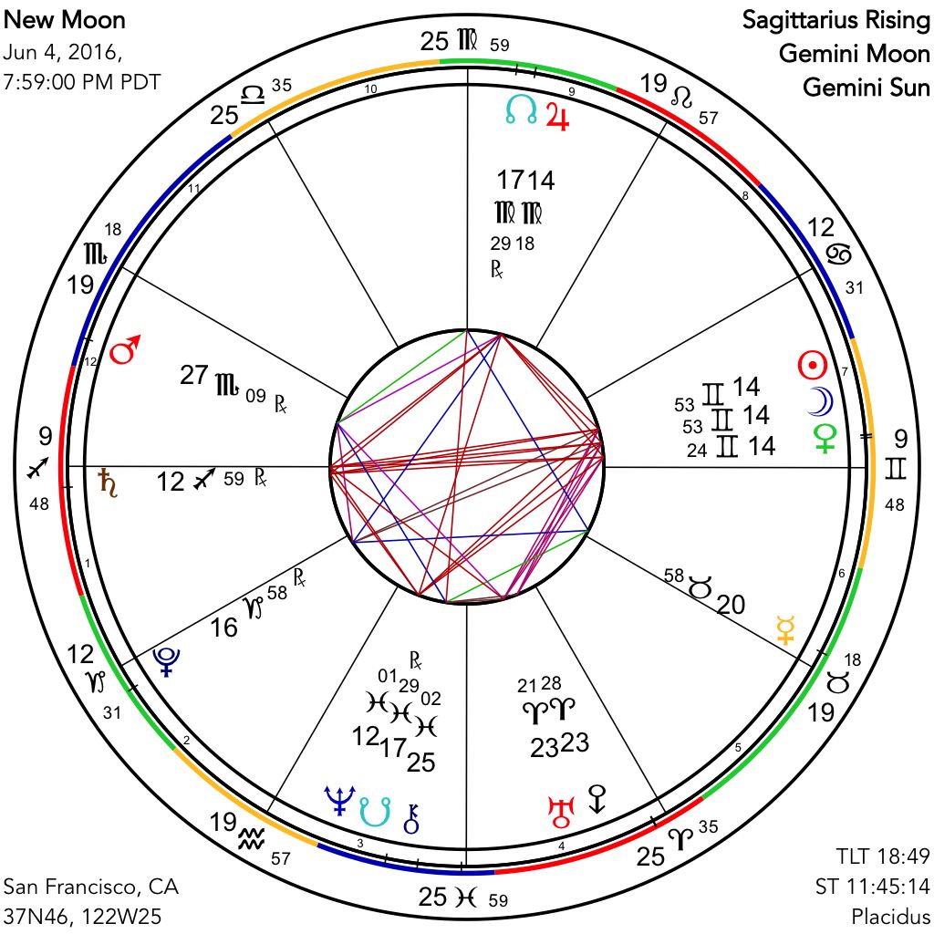 Saturday evening's New Moon in mid-Gemini is very dynamic, being exactly conjunct Venus and making with that planet of beauty, art, and relationship a Grand Cross in mutable signs. Saturn is opposite in Sagittarius, and Jupiter and Neptune on either side, in Virgo and Pisces respectively, are square with the Sun, Moon and Venus. This is a strong showing for these planets, their energy bouncing off each other, giving combinations of any two of the six planets. The New Moon additionally aspects Pluto, while Uranus is also emphasized by his forming very close conjunction with the new planet, Eris, and by aspect to retrograde Mars, closing in on a nearly exact inconjunct aspect with Uranus as he stations in another two weeks' time. The transformational pressures that we have seen all this year are still very much with us, especially in the late Saturday, early Sunday timing, and as well over the entire thirty-day period of this rather intense lunation cycle. We obtain inspiration wherever we can find it, and it leads us out of stasis that is perhaps getting stale, and into brand-new territory that has a touch of idealism to offer us, and yet might also partake of sensible stability. The more grounded presence of Saturn in this configuration can manifest as a nay-saying reaction to the Jupiterian and Uranian impulse for freedom at any cost, creating warring factors within our psyches, or else allow us to put in place a practical element that fosters our juiciest ideas, ensuring that some sort of action is reasonable, planned out, and will ensue.
