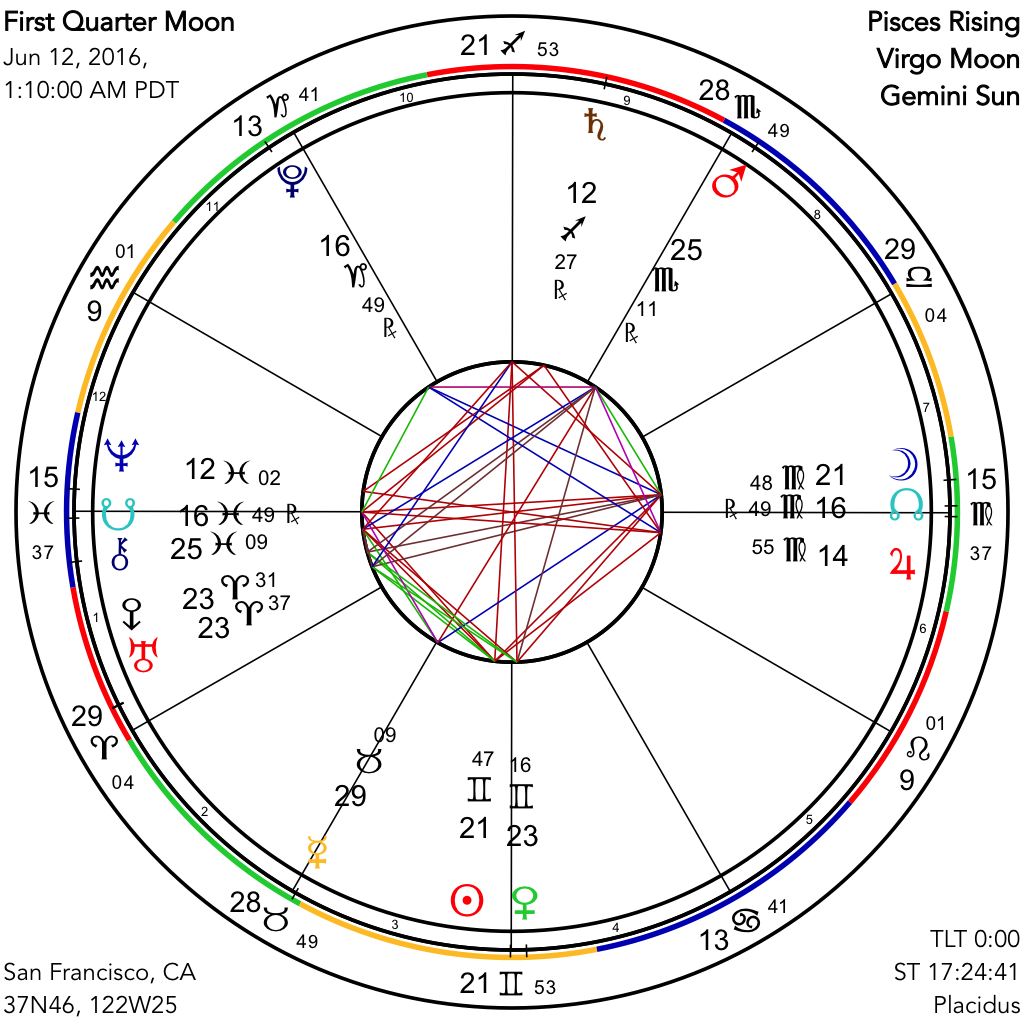 Sunday's First Quarter Moon, arriving one week after the intensely transformational Grand Cross Gemini New Moon, therefore serves as a further delineation of our understanding of ourselves and of our most basic mission, in light of the experiences and insights of the preceding week. We are seeing how the seed vision with which we began this time might fare as we encounter the inevitable delays, obstacles and practical requirements that our dreams have had to run up against. As far as the presence of Pluto and Uranus that showed up so strongly, along with the other outer planet energies, in the recent New Moon, they remain prominent in this current configuration, implying that the transformational process in which we were then engaged is still quite active now. Pluto remains closely trined by Jupiter, and by the lunar North Node, while Uranus is closely aspected by the Sun, the Moon and notably Venus, in partile sextile, while Uranus is even more closely conjoined to Eris, the new planet beyond Pluto, which stands for a Warrior Goddess in support of soul intention.