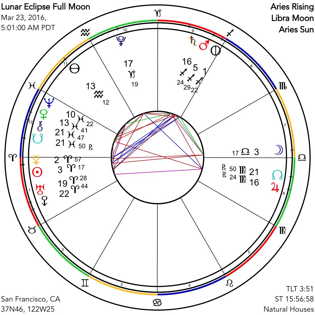 Chiron, too, is highlighted greatly in this Full Moon eclipse configuration, being parallel the Sun and Moon, and by virtue of his close conjunction to the lunar South Node. Chiron is also exactly semi-sextile in the sky to Eris, one sign away in the 23rd degree of Aries, adding further emphasis in the direction of soul empowerment. Chiron represents knots — or 'complexes' - of broken-off energy, buried deep within our psyches, where we have been wounded in the past and may yet heal. The revival begins with concerted effort toward acceptance of these dark places within us without judgment, shame or blame, instead substituting a simple acknowledgment of their existence. Then we can begin to see the ways that they contribute to reactivity, and impede our progress toward what we truly wish for ourselves, long-term.