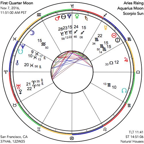 The Sabian Symbols for this First Quarter Moon might shed further light on the tenor of the times. For the Sun, in the 16th degree (15+) of Scorpio, the symbol is a pleasant one: “A girl’s face breaking into a smile.” Marc Edmund Jones references, “the need to share any true essence of selfhood,” a theme that has been discussed in the preceding paragraphs. He goes on to state that, “No ultimate values can be cloistered forever in the depths of self … [one can even employ] the simple things of life for surmounting momentary obstacles to self-fulfillment.” For the Moon, in the same degree of Aquarius, we find: “A big-businessman at his desk.” This symbol is ironic, for while we can see in its essence an emblem of excellence in striving, it also today holds a resonance of the steam roller effect, at times, of big business run amok. Jones calls this degree “effective self-realization” and also has, “the position [that] an individual may win among his fellows requires a constant attention to his [or her] fundamental interests through the ebb and flow of circumstances.” Indeed we must constantly monitor all of our actions to see if we can successfully determine to what end they are tending. Only those that match our deepest intention will pass the test of ultimate usefulness for our soul’s continuing evolution. As American poet Robert Frost puts it “Only when love and need are one/ And the work is play for mortal stakes/ Is the deed ever really done/ For heaven and the future’s sakes.”
