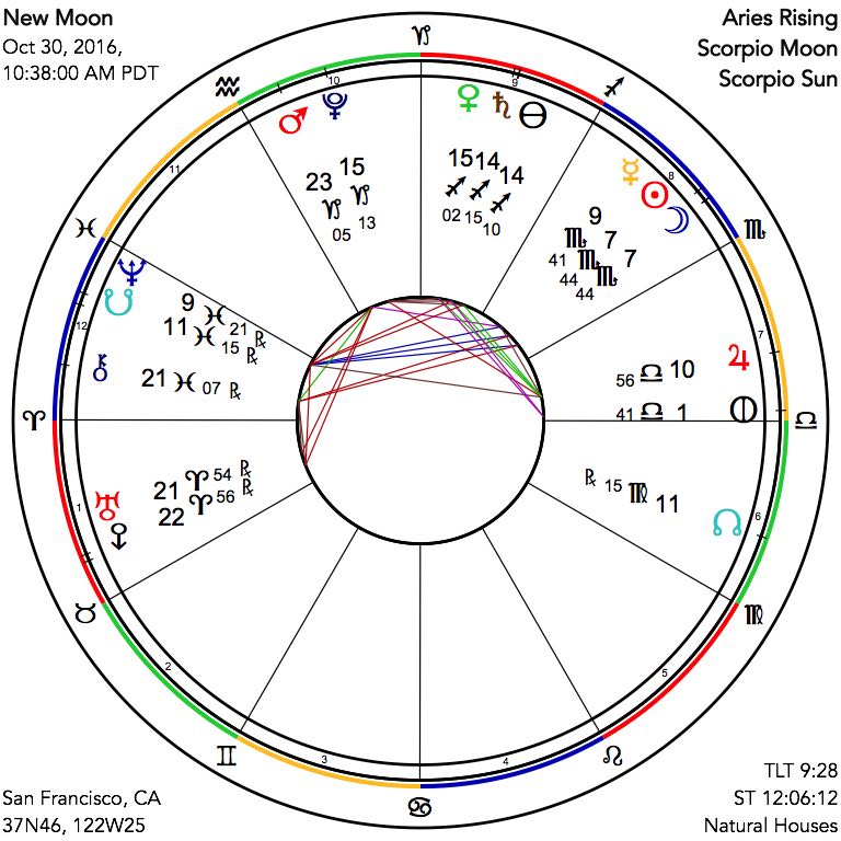 The Sabian Symbol for this New Moon degree is the eighth of Scorpio: “The Moon shining across a lake,” which brings the motif of calm, spiritual confidence, based in a natural setting, and of the Water element. These of course support factors of important soul connection within ourselves, in the deeper layers of our being. Marc Edmund Jones references “the magic on which [we] always may call, when facing any problem of inner or psychological adjustment.” He goes on to say, “implicit in the symbolism is a fellowship of feeling which leads to all romance and which enables human hearts to gain their moments of release from the outer compulsions upon them and thus achieve their … more enduring orientation.” Indeed, the world of Nature, and of Spirit, supports us in all that we do, if only we have the grace and the presence of mind to turn our inner gaze to it.