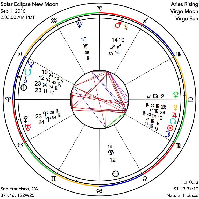 The Sabian Symbol for this New Moon eclipse supports the paradoxical tenor of these times. It is, for the 10th degree of Virgo, "Two heads looking out and beyond the shadows." This reminds us of the way that we are all, in some sense, in struggle with the shadow-side of our multi-level personalities, exhaustively discussed in the modern practice of depth psychology initiated by Freud and Jung at the beginning of the previous century. There is a way that we are simultaneously transcending the darkness within us and also caught by it. Marc Edmund Jones refers to mankind's "intellectual genius on the one hand," versus "exceptional mechanical sense in everyday practical realms on the other," and goes on to state, "inner and outer facets of reality are merged in the effectiveness of [our] judgment ... bringing the various phases of human enterprise to some unity of common purpose." May we all be so blessed.
