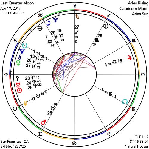 The Last Quarter Moon of early Wednesday, April 19th emphasizes the conservative nay-saying of stodgy Saturn, with the Sun in the final degree of Aries making a close trine to Saturn in late Sagittarius, and the Moon, retrograde Mercury, Venus, Mars, Jupiter, and Uranus also closely aspecting this emblem of the Senex archetype. This contrasts with powerful Uranus, representing innovation, by in effect putting up barriers to change, saying “oh no you won’t.” The polarity of progressive versus conservative empowerment is thus invoked.