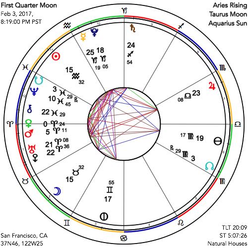 The First Quarter Moon of Friday evening / Saturday early morning, February 3rd or 4th, is a strong one. This takes place in the middle or power degrees of the fixed signs of Aquarius and Taurus, indicating that internal forces are locked in conflict or dispute, and that something needs to give. The symbolism is also there for implying that matters are in motion. This is indicated by the extreme volatility of trickster Uranus opposite Jupiter being once again highlighted in this current configuration. In fact, Jupiter is stationing within a few days time, further enhancing this aspect of sudden insight, and of adapting to changing conditions with brilliant ideas to work strange new compromises. What we have here is thus both a supremely stuck situation and, on the other hand, the ability to seek unusual methods of getting your way, along with the capability to yield gracefully when you cannot.