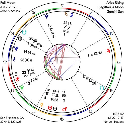 The Sabian Symbols for this Full Moon are of interest. They are, for the Moon in the 19th degree of Sagittarius, “Pelicans moving their habitat.” This is a somewhat mysterious symbol that can at least be related to the natural world that surrounds us and sustains us. Marc Edmund Jones sees this as individual decision-making and transformation, and remarks: “this is a symbol of the ultimate integrity of individual character… when life becomes unprofitable in one phase there are always additional areas of realization… indomitable originality.” For the Sun in the same degree of Gemini, in a reference to perennial wisdom, we find, “A large archaic volume.” Jones references “the ultimate indestructibility of experience” and “illimitable resources in wisdom [that] may be made manifest at any time in immediate and practical guidance.” Indeed, we need something beyond ourselves to adhere to our true path forward, no matter how beset with difficulties. Fortunately it is there for us when we lift our gaze to look.