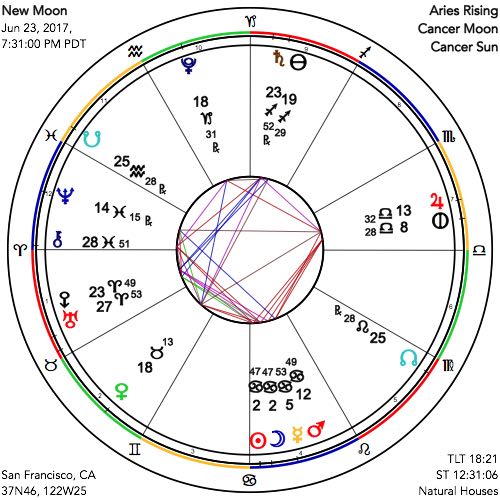 Friday evening’s Cancer New Moon features an important trine between nebulous Neptune and the mid-Cancer placement of Mars, located in the same watery and emotional sign as the Sun and Moon. Also to be found in early Cancer is Mercury, making of this next thirty days a quietly emotional and thoughtful time of deep introspection, and uncertain and potentially spiritual outcomes. This is quite a watery month, emotionally rich and full of the tendency to look backward as well as forward. Sometimes the past can indeed be an excellent guide to the future if only by way of what you wish to avoid or eliminate. And, indeed, with Pluto also strongly configured in this New Moon, there is great energy for personal transformation and for letting go of that which no longer serves you. Saturn is also in exact trine with Eris, the new planet beyond Pluto, signifying a spiritual warrior energy, so that you might encounter a strong feeling for finding your true values, deep inside, and sticking to them.