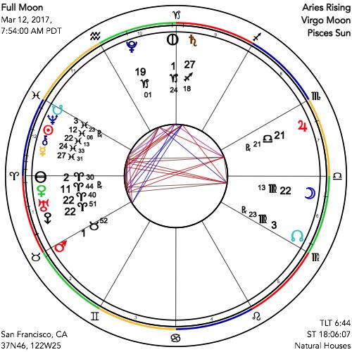 The Sabian Symbols for this Full Moon are, as usual, of interest. They are for the Sun in the 23rd degree of Pisces, “Spiritist phenomena,” referring to the American movement of communicating with the dead that was more current in the 1920’s when these symbols were originated, a movement that came into being coincident with the discovery of Neptune in the mid-1800’s. Marc Edmund Jones refers to “the organic integrity of the world at large,” and the “facility for actual and conscious cooperation with the potentials of an immortal reality.” Of course it is important to recognize that the largely unseen is nevertheless a highly significant life factor, and that to get in contact with it we must sometimes “close our eyes to see.” For the Moon in the same degree of Virgo we find, “An animal trainer,” which reminds us that while we inhabit our bodies we are utilizing them as well for goals that shine above and beyond the merely physical. Jones comments that “an individual will be conditioned more and more hopelessly by environment and experience if he [or she] fails to give continual attention to his [or her] potentials and to the self-discipline [required] to develop them.” Indeed connection to our higher selves takes work, and is not for the faint of heart. As with much else in life, however, the rewards are there in equal measure for those who follow this more difficult path to the greater realization of all that we are fully meant to be.