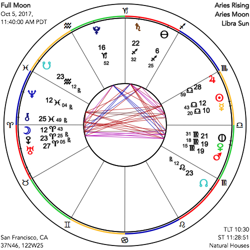 This Full Moon is also loaded with partnership themes, so that issues with significant others, as well the very concept of relationship in our lives, is up for thoughtful review and a deepening of our understanding. Being a Libra Sun opposed to an Aries Moon, and as well because we find their rulers, Venus and Mars, in a partile conjunction, the relationship theme is definitely emphasized. Then, too, Mercury, conjunct the Sun, is the ruler of Virgo, the sign occupied by Venus and Mars, meaning that we find Mercury and Venus in mutual reception, another indication favoring relationship, values, and aesthetics. With all these Venusian factors highlighted, we will be thinking about the importance of our basic values, and of others, for our continued well being as compassionate humans. We will be thoughtful about the care and feeding of all our relationships, and aware as well as the many compromises necessary to keep them fully alive and vibrant.