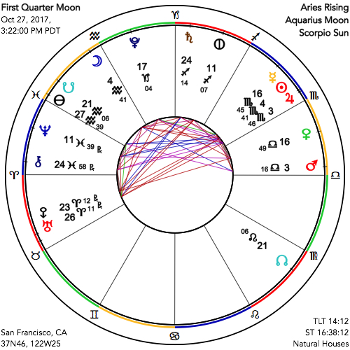 The First Quarter Moon can tend to be a challenging phase of the lunar cycle. It is when the symbolic ‘seeds’ that were planted at the New Moon are now young plants trying to sprout their first leaves. It is a time each month when we are asked to exert our will and put in the effort required to bring the latent energies of the New Moon into manifest form. This particular First Quarter Moon in Aquarius follows the recent Libra New Moon, a configuration that rules the entire thirty-day cycle. This New Moon was notable by the fact that, by a very close opposition, it activated unpredictable Uranus. In light of this, it is important that we recognize the trickster influence throughout the entirety of this lunar cycle, as events continue to surprise us, and to provide unanticipated enlightenment. As the pot gets stirred, and even shaken up, we can expect the unexpected and also look for new openings allowing genius, brilliance, and innovation to emerge.