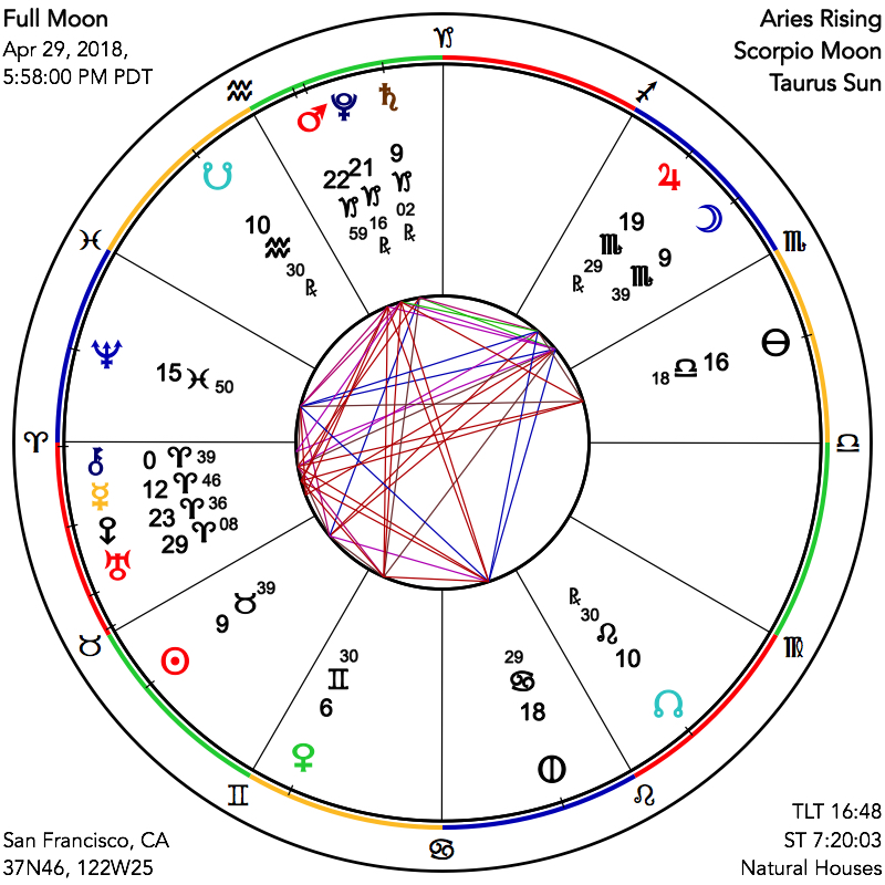 With Venus and Mars also in the picture of this Full Moon, the development that we seek will likely come to us through relationship, at least in part. And this is not only astrological but also logical, since we are often able to see more of ourselves, especially in our deeper layers, by means of the reflection that we get from important others. Venus is closely contra-parallel to Mars as well as in minor aspect, and Mars is powerfully emphasized by means of his conjunction with transformative Pluto and his parallel to Saturn. There is thus a strong likelihood that some form of reactivity will be a significant part of what we encounter in the arena of interpersonal connection, and there the prescription is that we keep in mind that “you are never angry for the reason that you think you are.” Instead, core wounding plays a role. The idea is to stay cool, and to walk yourself back from the hasty word or deed, taking time for yourself as necessary. This is easy to say, hard to do, but could be vital for your continued growth and well being if you can pull it off.