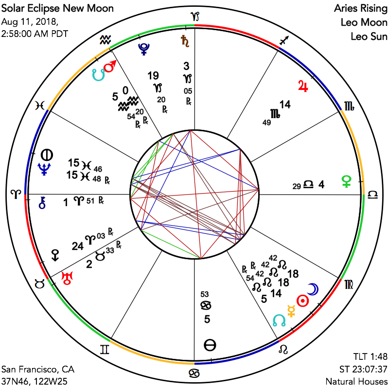 Saturday’s New Moon, taking place in the morning of August 11th, is yet another eclipse, the third in a series of three telling configurations this summer. The previous two, from mid-July and then the lunar eclipse of July 27th, were quite powerful and featured both Pluto and Uranus, harbingers of major cultural and personal transformation. This one is similar, with the Sun and Moon in close aspect once again to transformational Pluto, while retrograde Mercury becomes parallel to trickster Uranus, the latter also in close trine to limiting Saturn. This configuration is thus a fitting end-point to the much-touted summer of 2018 eclipse season, an end that is also a new beginning. What is the overall effect of these challenging times, as reflected in the heavens, and in the news, not to mention private individual experience? As the poet Gerard Manly Hopkins puts it: “Why? That my chaff might fly; my grain lie sheer and clear.” In other words, by going through the difficulties and the life-changing experiences of these times, we are building character. And in life here in the physical, there may indeed be no other way for that to happen. This is sometimes referred to as the “school of hard knocks.” Definitely it is schooling. With the aid of the astrological picture we get some validation for our trials that we are going through as being of a more general, and incidentally more spiritual, nature than we oftentimes give credit for. Plus, we can get a hint of some of the details.