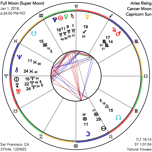 That this Full Moon comes on the very first day of a new year is also of course quite poignant. All individuals everywhere are hoping for the world to somehow hew more closely to their wishes, whether for prosperity, their freedom, greater available love, or world peace. This is very much in keeping with the strongly Neptunian tenor of these times, and of this Full Moon in particular. We now have our ideals on full display. We are also subject to the illusion of an easy path to our innermost wishes, even though Saturn, newly arrived in his home sign of Capricorn, is telling a different story. As this second decade of the 21st century draws nearer to its close, the future that we want to see emerging is doable, and as singer-songwriter Paul Simon says, “only a motion away,” but it will take lots of hard work on the part of everyone to see it through.