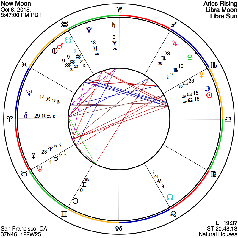 With numinous and otherworldly Neptune highlighted both last cycle and in this one, there is also a degree of confusion that will remain in the air for at least the remainder of the month as to what can be seen as the absolute truth of any matter. In personal terms, this is where it gets tricky; go from your highest ideals, yes, always, and yet also somehow attempt to discern what your bottom-line principles in fact really are. It is also important to note that there is a spiritual dimension to all our dealings now that we will want to pay attention to. Chiron, the Wounded Healer, having only just now dipped back into Pisces, and being closely aspected by Mercury in this New Moon, speaks to the painful nature of the feelings that we may have, personally, as we transform. This is over what has been gained, and what lost. On the national scene as well there have been many painful realization on both sides of the political isle. The vote to confirm Justice Kavanaugh conformed, with two exceptions, to strict party lines, so that the gulf between the opinions of different groups of people, and different political parties, remains as much of a chasm as ever. And this reflects the continuing aspect between progressive Uranus and conservative Saturn, which although now fading still remains close in the timing of this New Moon, at little more than two degrees.