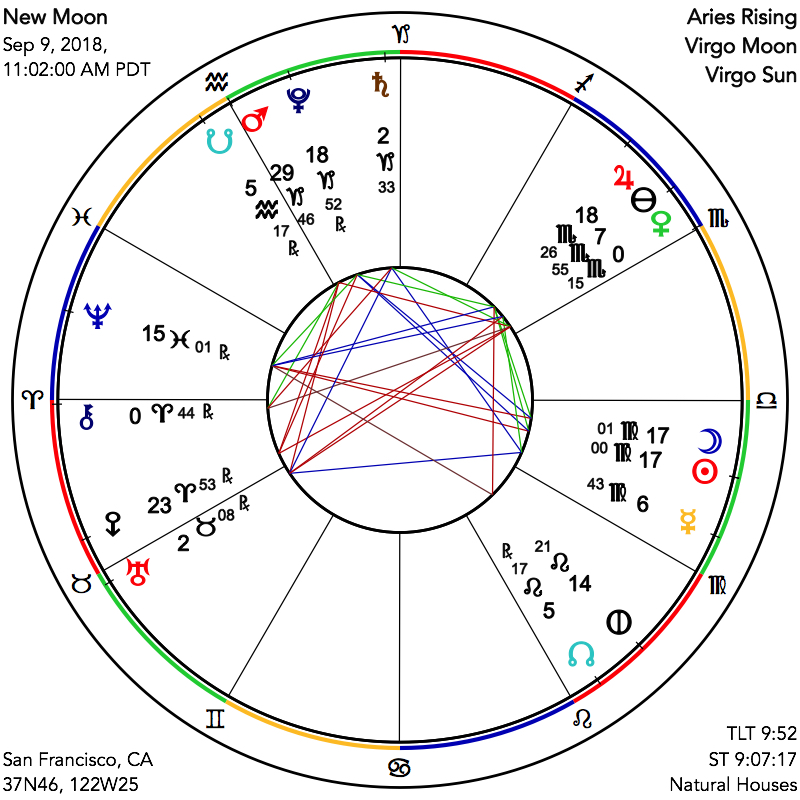Sunday’s New Moon, taking place mid-day on September 9th, represents an interesting follow-up to the rather intense eclipses and retrogrades of summer. This is the first New Moon following that series of very powerful lunations, all featuring outer-planet engagement, which hence have indicated a tremendous level of transformational involvement for every one of us. And this particular lunation also represents strong outer-planet alignments, with Uranus, Neptune and Pluto all highlighted, along with Saturn and the new planet, Eris. The New Moon degree of 17 Virgo is in close sesquiquadrate alignment with Uranus, while trining Pluto and opposing Neptune. Saturn, just stationing and therefore more prominent, lies in partile trine with Uranus. Major transformation, at both individual and societal levels, would seem to be our current path. And yet, transformation doe not come easily. Something new is coming into being, and, as well, something must be given up. The idea of Earth being a fourth-ray planet, whose symbolism invokes Harmony Through Conflict, lets us know that this is just the way that we have it, as we struggle through here below. And this tells us quite a lot about the human condition; we evolve to the higher levels of manifestation that is our birthright quite slowly for the most part, and of necessity. We grow when there is no other choice for us but to grow.