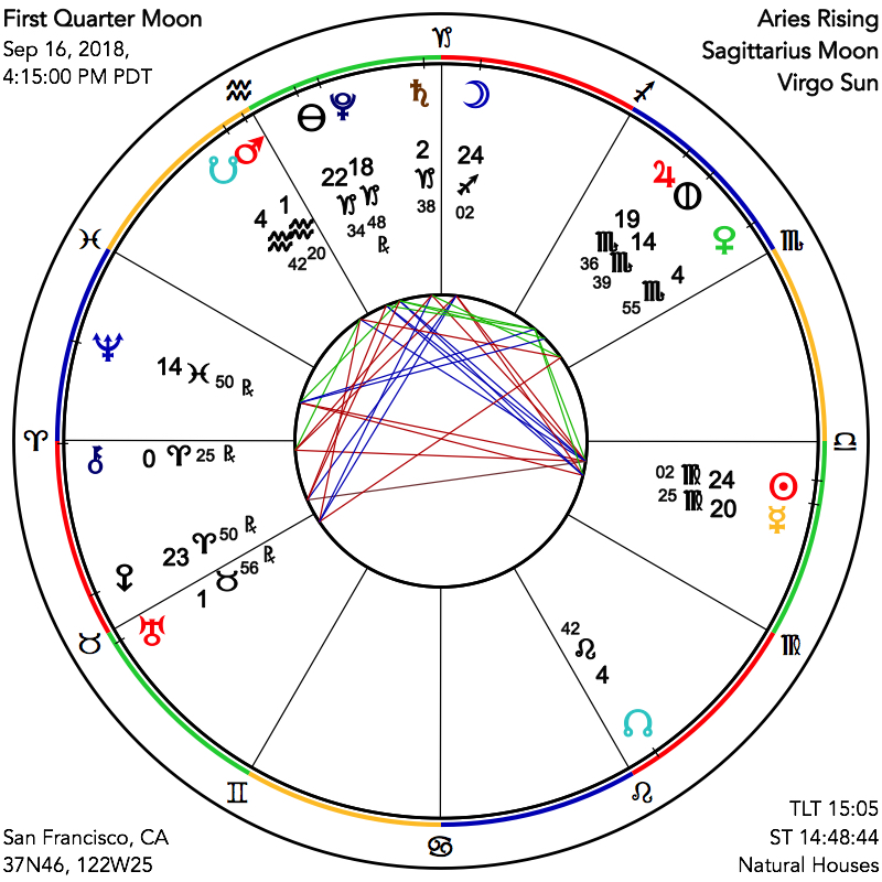 The First Quarter Moon is the time in each lunar cycle when the light coming to us from the Moon is growing (waxing), and when we are asked to tend diligently and assertively to the seeds we are sewing and growing during the lunar cycle thus far. This lunar phase also marks the moment when the Moon makes a 90º square aspect to the Sun. Square aspects represent creative tension and challenge, inviting and fostering growth through effort. During this particular First Quarter Moon, taking place on Sunday, September 16th, in the afternoon or evening, depending on your location, the Moon in explorative Sagittarius is square to the Sun in refined Virgo. The astrological sign of Virgo asks us to point our awareness towards cleaning up and sorting through – both in the material world, and in more intangible realms – keeping and sprucing up that which is of use, and returning that which is not to the compost pile. Contrastingly, the Moon in Sagittarius asks us to expand upon and to further explore more options than we had previously considered. It’s a bit of a trick to bridge the broad brush strokes of Sagittarius with the micro fine pointillist dots of Virgo, and yet when we find a way to marry the two, why then we may find that we have a gorgeous painting to enjoy! In other words, this is the time to tend to the Virgoan nitty gritty details, but not to get so lost in them that they slow your momentum of what you truly wish to create. We note that Venus will begin her retrograde on October 5th, so don’t hesitate on things you want to move forward. Be precise and mindful, and yet also swift!