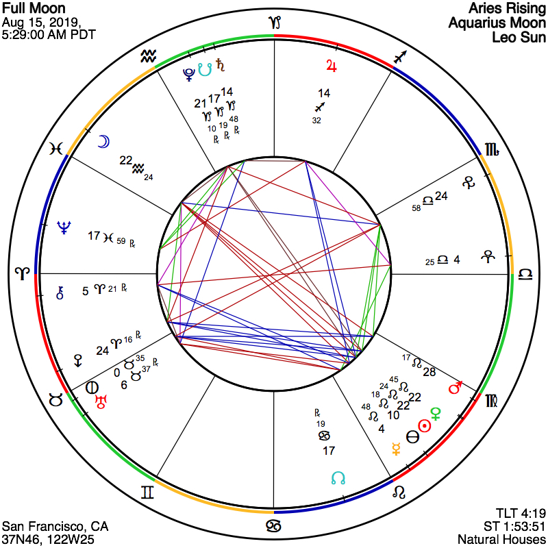 In the chart of this Full Moon we find the Sun in a very nearly exact conjunction with Venus. Venus in her goddessly ways reflects to us our embodied experience of inhabiting this earthly plane, and attunes our senses to beauty, connection with others, and our values– both in terms of what we value externally and internally. As we find her in Leo near the Sun and being reflected by the perceptive luminescence of an Aquarian Moon, we may be getting a unique and perhaps startling view of where we’re at in our development as relational beings. Relationships are not a subject we are required to learn about in school, yet they are perhaps the single most important determining factor in our happiness and fulfillment as human beings. Many of us have reached adulthood without having received any teachings on how to have healthy, thriving relationships, and only begin to seek out that information once we discover for ourselves that what are doing is not working very well. All of this Venus activity is prompting us each to really take a hard look at ourselves and how we are with and in relationship, and seek out new resources and teachings to learn and grow. It is actually propitious that this Venus spotlight is coming with a dose of Aquarian “big picture” perspective, as it may be helpful to take a few steps back from yourself and others in order to see more objectively and clearly what’s at play here. Beyond this, in terms of Venusian themes, you may notice yourself contemplating and asking about how you are spending your time and energy (and money!), and if you’re expending your precious life force on things that truly matter to you. You may wish to take some time around the Full Moon to identify or reflect upon your core values, and inquire how or whether you are living in alignment with those values.