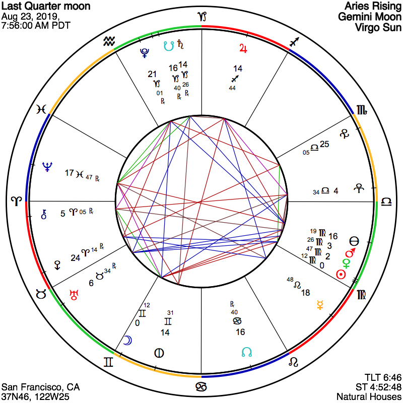 The Sabian Symbols for this Last Quarter Moon are, as usual, instructive. For the Moon, in the first degree of Gemini, we have, “A glass-bottomed boat in still water,” which might remind us of true perception and discernment. Marc Edmund Jones, who prompted the creation of these symbols in the 1920s, comments, “This is a symbol of mankind’s alertness to every ramification of experience open to him, or her, and of the necessity that one take definite action on one’s own account if one is to capitalize on any particular opportunity.” For the Sun, in the first degree of Virgo, we find, “A man’s head,” seen here as an emblem for the human condition. Jones remarks, “the ideas of an inner life are given their outer manifestation through self-accepted responsibility on which others can count… the keyword is character [representing] an effective self-assurance and an ever-clear vision of each emerging opportunity in life.” It is, indeed, individual character that must be exercised now by each one of us, if we are to evade the jaws of our ongoing societal dilemma and emerge whole into the next decade of our common existence on this beautiful and fragile planet.