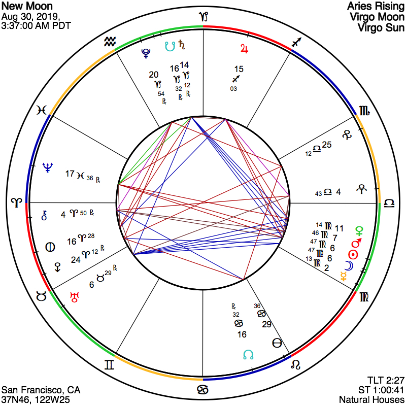 Venus’ themes of values, connection, and desire also come into prominence with this New Moon, as we consider her forming trine aspect with Saturn, at 14º Capricorn, close to the South Node there at 16º. We may see this as considering that we are undergoing a distillation process around our heart’s longing, getting current with what it is we truly want and desire from an inner space that is clear and coherent. This is a very supportive time to deeply consider your core values, and what kind of structures you are actively seeking and creating in your life in a way that actually manifests your visions. The karmic structures that once supported and simultaneously confined us are in a process of dissolving and dismantling, and as this unfolds, we are offered tremendous new potentials for liberation, growth, and breakthroughs. We may also be confronted with our own patterns of resistance, aversion, and as well the grief that comes with significant change. As the month progresses we will find that all of these personal planets now in Virgo, one by one, form an opposition with Neptune in Pisces, the question becomes one of Trust. How much can we accept the places within ourselves that feel afraid, and with courage open ourselves to the Loving Arms of the Universe? How can we take action from that place of Trust and of Love? Can we be in connection and collaboration with each other from that place, as we mutually endeavor for liberation, forgiveness, and brilliance? Can we simultaneously hold acceptance for all that is and can we do that with a fierce desire and stance for transformation? We are being asked to stretch and evolve our awareness to hold a far greater truth than black or white, right or wrong, left or right; we are being asked to get comfortable with paradox, and the vastly complex nature of existence. May our perspectives, intentions, and desires be aligned and coherent in this present moment as we collectively weave ourselves into a more brilliant and loving human tapestry.