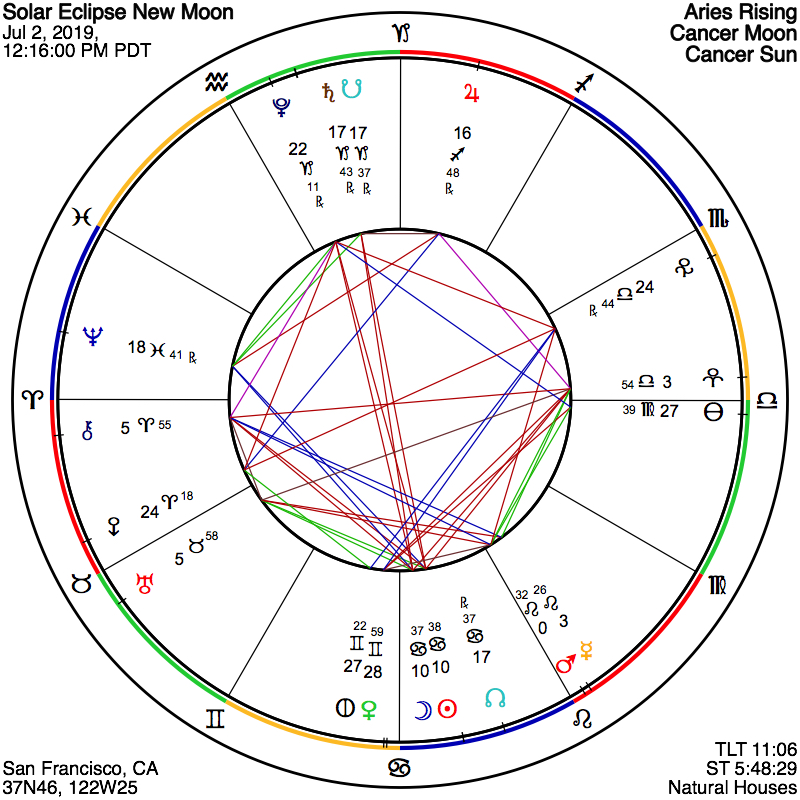 The Solar Eclipse New Moon of July 2nd, 2019, exact at 12:15 pm Pacific time, will take place at 10° + of the cardinal Water sign of Cancer in alignment with the Moon’s nodal axis. This marks the beginning of an Eclipse Season that brings significant transformative unfolding in our personal lives and collective realms. Eclipses are representative of larger cosmic cycles and bring with them depth, intensity, and energies of great change and awakening. They come in pairs or threes, and this time it’s a pair, beginning with this Solar Eclipse in Cancer and followed by a Lunar Eclipse in Capricorn on the 16th. This Cancer-Capricorn axis has and will continue to be activated throughout the coming months on into 2020, and the lessons that we may reap from these zodiacal signs are many. Both Cancer and Capricorn are Cardinal in their modality and feminine in their polarity, and this comes in contrast to the most recent series of eclipses we’ve had on the Leo-Aquarius axis, which are fixed and masculine. Cardinal energy is like a hinge point— a place upon which things can turn or revolve— and feminine energy is more receptive, in-taking and subtle. In these terms, we can look at this eclipse season as an opportunity to really reflect on our internal state of being. We might be able to shift some deeper patterns, thereby forging a more aligned path as we move forward. This axis is also about honoring heritage, connecting with ancestry, and considering the needs of the family unit and the responsibility we have to our community and society at large. You may feel called to tap into your ancestral roots, and deeply consider what’s been handed down to you. In doing so, this period may serve as less of an exercise in dwelling in the past, and much more as a contemplation informing your understanding and your motivation moving into the future. It might be time to ask, what will you (and we, collectively) be handing down as a legacy to future generations? There is a serious and on-purpose tonality for Cancer and Capricorn, asking us to take a good hard look at ourselves both internally in our emotional states, as well as outwardly in our worldly contributions, and to be honest and in integrity about where we actually stand.
