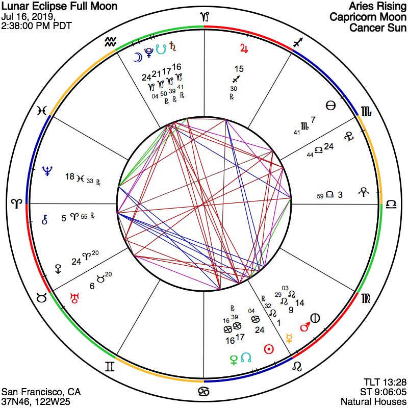 Tuesday’s Lunar Eclipse, the follow-up to the Solar Eclipse and New Moon of Tuesday, July 2nd, takes place on Tuesday, July 16th at 2:38 PM on the West Coast, later in the afternoon and evening for points east, and represents a rather dramatic astrological event. In this Full Moon, the Moon is closely conjunct a powerfully configured Pluto, signifier of evolutionary transformation. Also Pluto is currently in close parallel to Saturn, making these two powerhouse planets together the compelling news story of the month, and giving us a preview of their rather dire exact conjunctions coming up in January and November of 2020. In one way of reading the combination of Saturn and Pluto, it is difficulty, austerity, and contraction, along with what astrologer Richard Tarnas calls “conservative empowerment.” We are seeing some of that now in the tenor of the times, and more importantly in our individual response to the nature of the societal metamorphosis that we find ourselves in. Remembering the time-worn phrase that difficulty builds character, and that “when the going gets tough, the tough get going,” we might connect the dots from the initiatory passage of these 21st century days to a necessary personal transformation that each of us faces as we attempt to discover how to survive the next few years. It is becoming more evident that climate change must inevitably play a huge role in how world conditions unfold over the next decade or two, and that there might well be austerity measures involved. The human species does seem to survive in spite of everything, but it may be in a greatly altered form, especially regarding the structure of the society that will arrive to carry us through the coming environmental catastrophe.
