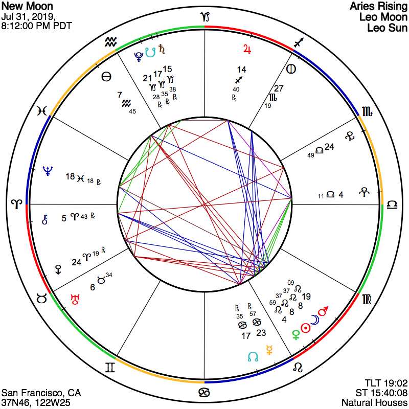 Most significant of all, perhaps, in this Leo New Moon, Saturn in close parallel with Pluto, to the tenth of a degree, signals a powerful transformational factor that is also present this weekend and throughout this next month as it further develops. Jupiter is precisely contra-parallel this pair as well. You may experience a metamorphosis at your very core., and have to learn even more profound lessons about what you need to keep, and what to let go of, as this climactic month and year continue to unwind.