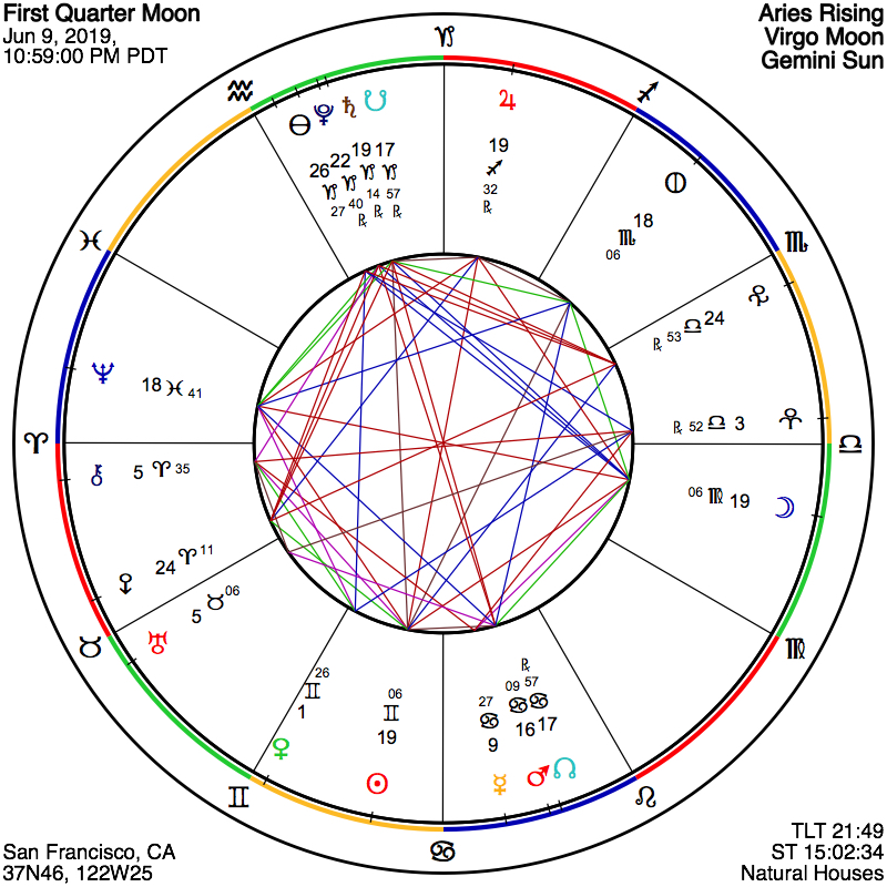 The Sabian Symbols for this First Quarter Moon might supply additional perspective. They are, for the 20th degree of Gemini (19 +) where we find the Sun, “A cafeteria,” and this reminds us that we are, in fact, all in this together, all eating at the same small table. Marc Edmund Jones has, “[We] organize our own special experience for the benefit of the community at large.” For the Moon, in the same degree of Virgo, we find, “An automobile caravan,” a symbol that strikes a similar motif of togetherness, and that also, of course, especially resonates in today’s America. Jones writes of, “nature’s prodigality as revealed through mankind’s genius for multiplying the facilities of modern life… an exceptional capacity for producing expanded dividends in every area of human activity.” May it be so! As we steel ourselves to face the issue of excess carbon in our atmosphere, coming upon our civilization like an express train, we will need all the innovation that we can mutually muster.