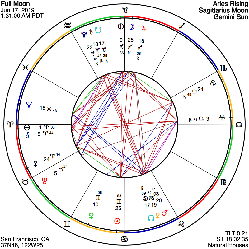 The Sagittarius Full Moon of Monday, June 17th offers us a chance to weave our spiritual nature more deeply into our sense of purpose and daily existence. In this dynamic configuration, we encounter a synergistic blend of cosmic influences, enlivening our awareness in multifaceted terms, and especially around personal responsibility, while also letting inspiration lead us forward. This enables us to better understand how we can utilize our will and agency as an expression of our Soul’s essential nature. Exact at 25º of Sagittarius on June 17th at 1:31am Pacific time, this is also the last Full Moon before eclipse season begins on July 2nd with a Solar Eclipse in Cancer. Full Moons are seen as times of culmination, when the seeds that were planted at the New Moon time have now grown and are bearing fruit. We have a big dose of idealism and explorative spirit with the Sagittarian influences, and also some heavier harsh realities from other planetary energies. This dynamic configuration can offer us both a clearer perspective of what positivity has come to fruition in this time, and also regarding unconscious seeds of bad habits and old patterns we may have allowed to grow as weeds in our garden, together with the spiritual learning that might ensue from new ways of seeing.
