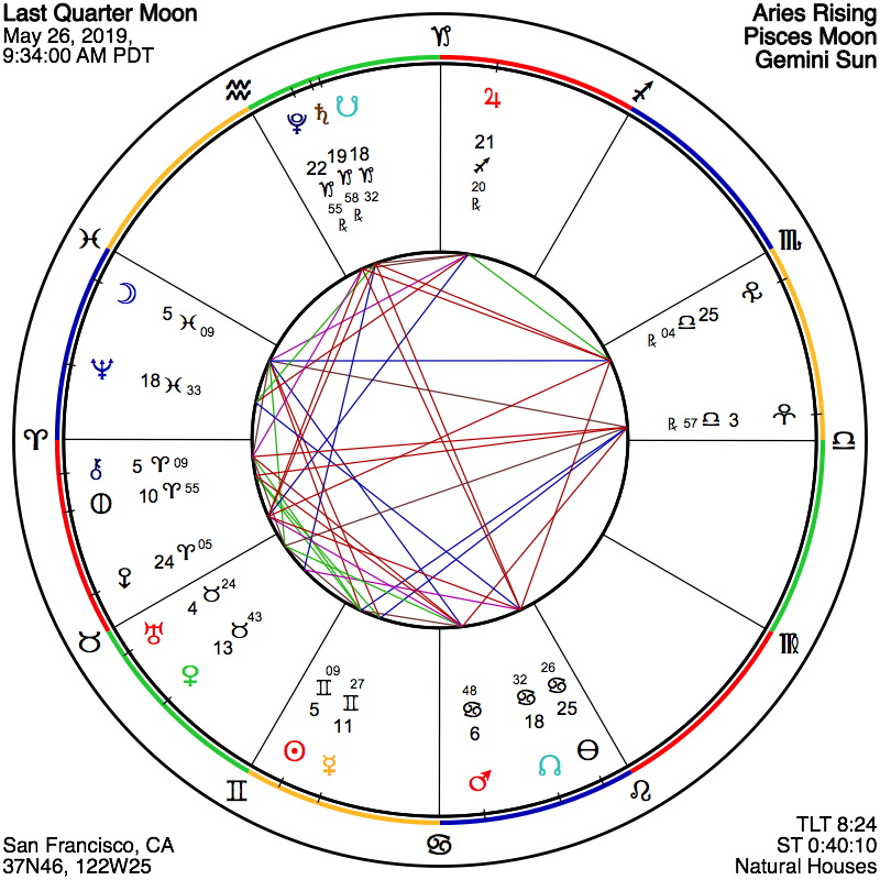 The May 26th Last Quarter Moon is a subtle call to inspiration and higher consciousness as an intense lunation cycle of May draws to its conclusion. This final lunar phase is the time when the brilliant light of the Moon is three quarters of the way in its journey of ultimately fading back into darkness. We symbolically see this as a time of letting go, surrendering and exhale. We find the Moon at 5º in watery nebulous Pisces making a square aspect to the Sun in quick-minded Gemini, AND, interestingly, completing a T-square with the asteroid Ceres in the expansive fires of Sagittarius. This paints a picture of dynamic tension that’s asking us to focus on what really nourishes us mentally, emotionally, and spiritually, and to let go of the things we reach for out of habit or addiction that don’t truly feed us. It’s not a quick or easy process to re-wire ourselves to reach for the glass of water instead of another cup of coffee, or to choose to meditate for 10 minutes in the sunshine instead of scrolling on Instagram, but the invitation now is to ask in each present moment what truly will enrich and nourish us in mind, body, heart, and Soul, and to begin following that inner calling more often.