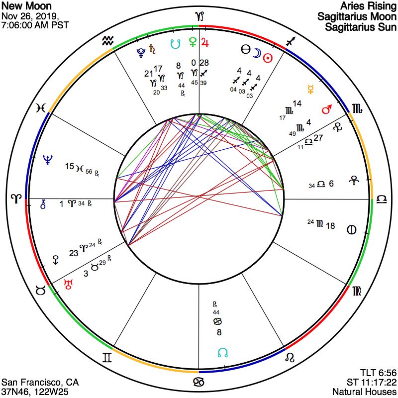 The New Moon that becomes exact on November 26 at 7:06 am Pacific Time takes place at 4º+ in the exuberantly explorative sign of Sagittarius, and brings with it an expansive and dreamy tone. In the midst of ongoing transformational intensity, there is the potential for profound spiritual insight, and yet also for confusion and anxiety, perhaps uncertainty, unless we can look closely into all that we are seeing and feeling, with caution and with critical evaluation. Sagittarian energy gives us the gift of broad insight, the gift for looking out to the horizon for a greater sense of faith and the spiritual tenants upon which we can optimally operate, and this is augmented now by a powerful placement of Jupiter. The contrasting energy of Saturn in its own sign of Capricorn, and in conjunction with Pluto, is once again also featured. With this New Moon, we may feel a generosity of heart, a renewed sense of exploration, and a yearning to learn the specific lessons for our own current developmental path.