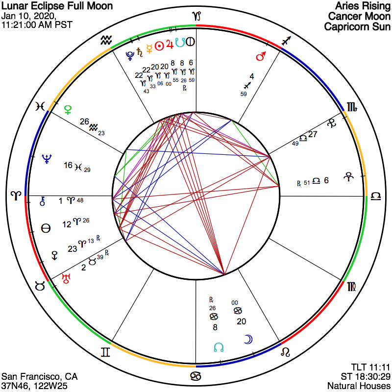 In regard to the global situation as affecting the responses of the U.S. population, there is also the symbolism to consider of Chiron, the Wounded Healer. It is quite significant that the Sun and Moon eclipse degrees of 20 + Capricorn and Cancer make a partile T-square to U.S. Chiron, located at 20 + Aries in the revolutionary birth chart from July 4, 1776. This highlighted presence of U.S. Chiron reflects the upset and fears of this population with regard to the decades of war without letup that began with the invasions of Iraq and Afghanistan in the wake of 9-11, and continues into the present moment. Chiron in our current skies is also highlighted, its placement in early Aries being emphasized in the Christmas Day New Moon eclipse that began the current cycle, and also closely aspected in the current Cancer Full Moon eclipse by a semi-sextile from volatile Uranus, and an extremely close quintile from Sun and Mercury. Again, consciousness is key, whether dealing with the lead-up to potential war with Iran, or dealing with our own internal wounding that can have the negative effect of inhibiting progress toward evolutionary growth.